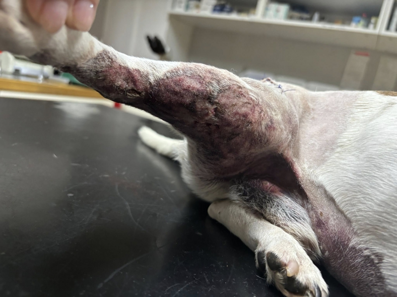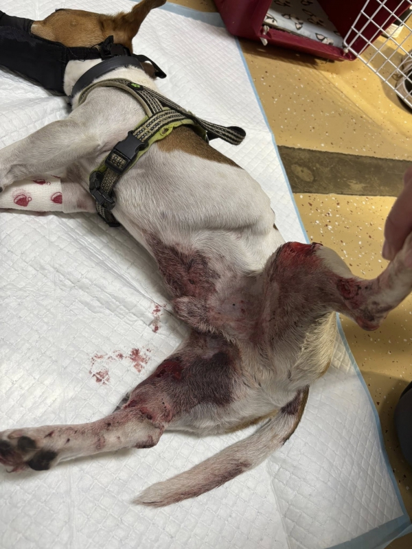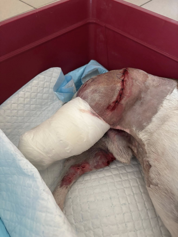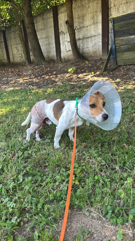 Bobi dnes absolvoval kontrolu a prevaz. Pani doktorka zhodnotila, že Bobi už obväz nepotrebuje a nožka može dýchať. Konečne po 3 dňoch ustúpilo krvácanie J Dostal golier a dalšia kontrola ak bude všetko ok až na stehy.
